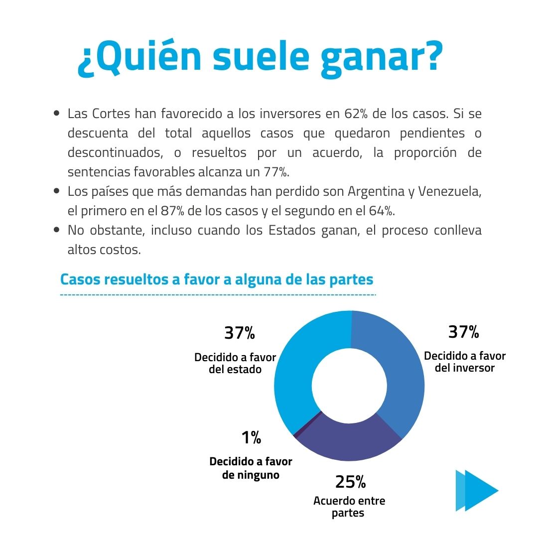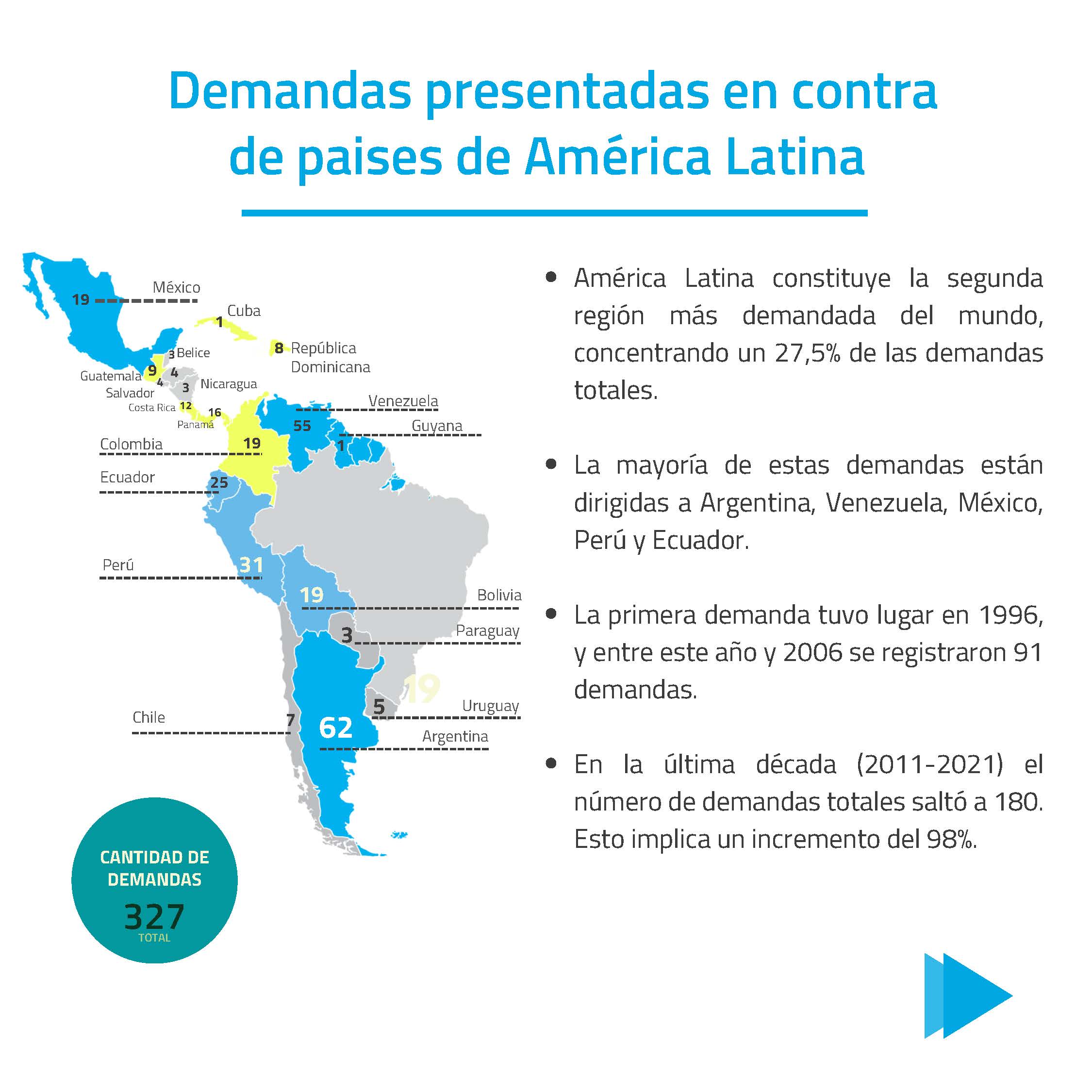 En las siguientes slides revisamos demandas presentadas en contra de países de América Latina, quienes suelen ganar, la procedencia de las demanda, quienes participan de los litigios, los bufetes preeminentes y los centros de arbitraje.