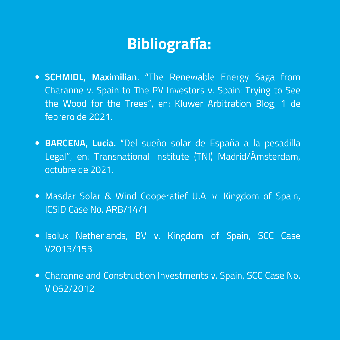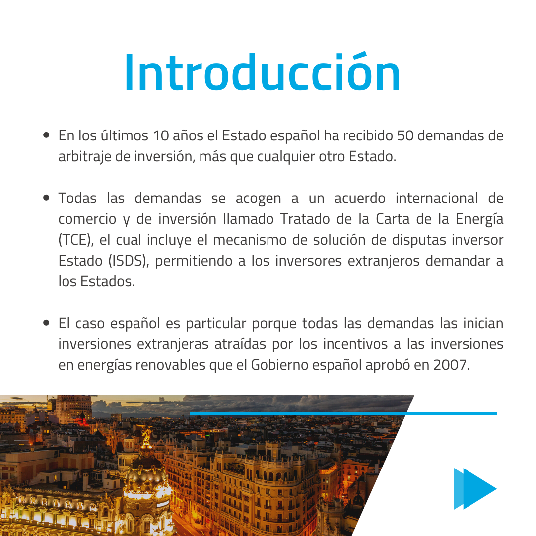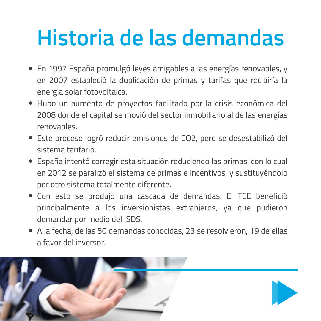 En las siguientes slides revisamos las demandas de arbitraje de inversión presentadas contra el estado español. Todas las demandas se acogen a un acuerdo internacional de comercio y de inversión llamado Tratado de la Carta de la Energía (TCE), el cual incluye el mecanismo de solución de disputas inversor Estado (ISDS), permitiendo a los inversores extranjeros demandar a los Estados.