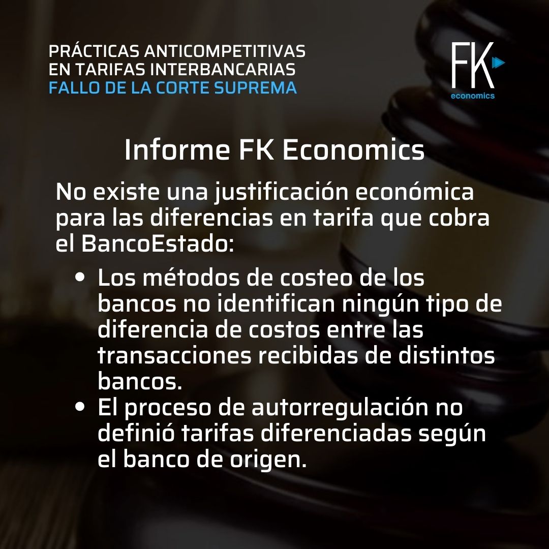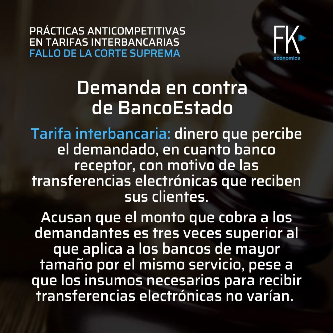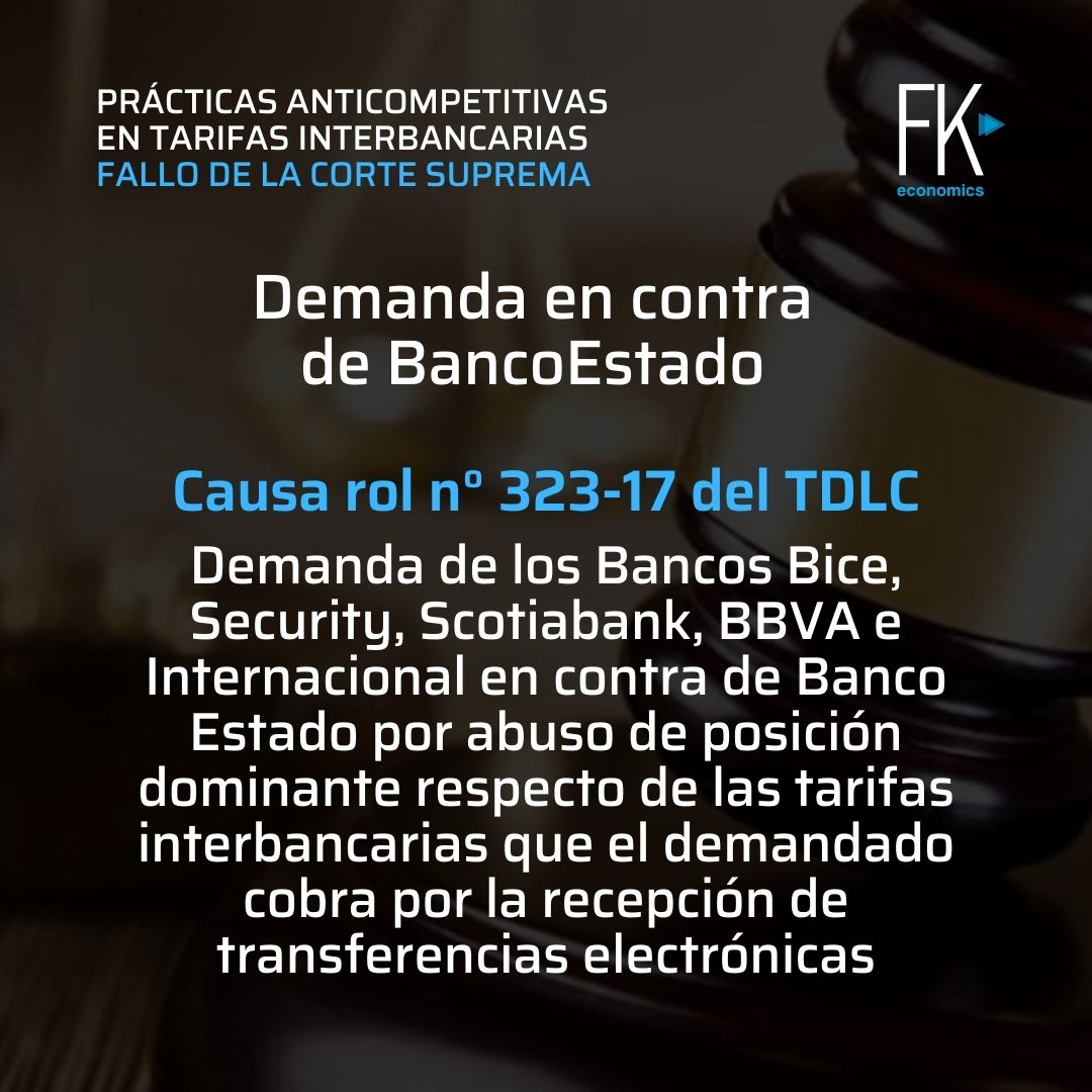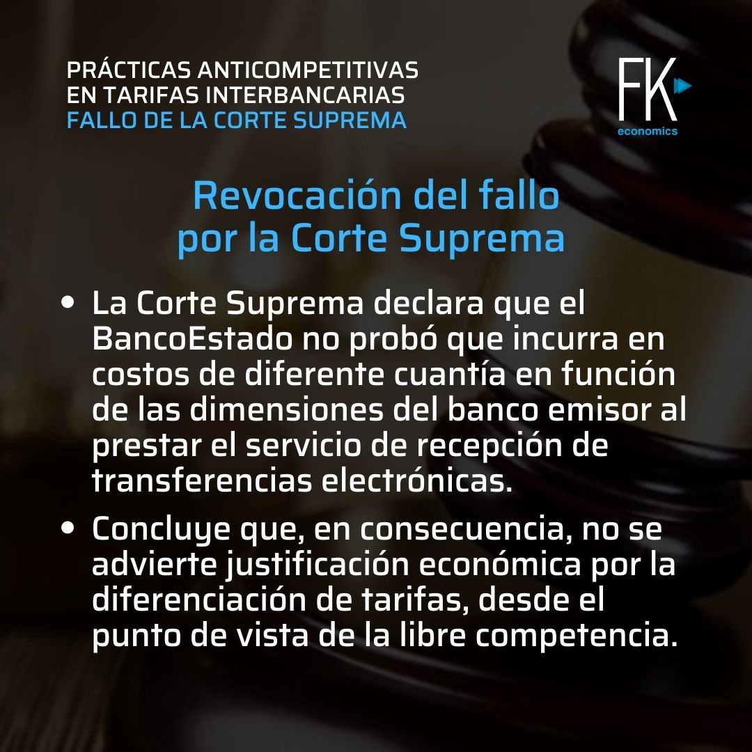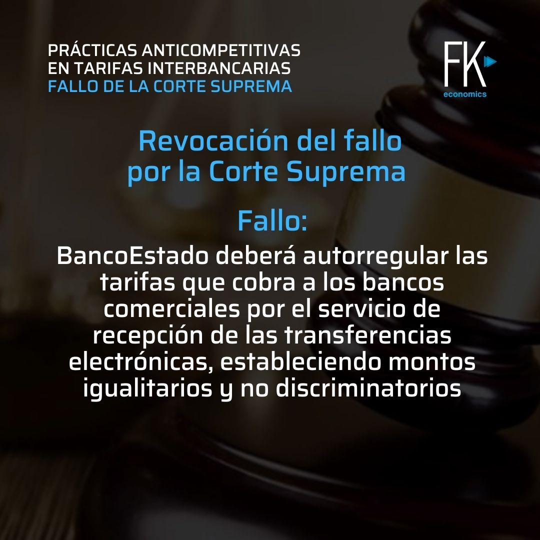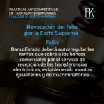 Hace un par de semanas la Corte Suprema chilena revocó el fallo del Tribunal de Defensa de la Libre Competencia (causa rol n° 323-17) y ordenó a BancoEstado a autorregular las tarifas interbancarias, estableciendo montos igualitarios y no discriminatorios para todos los bancos. Te explicamos y contamos más detalle de esta sentencia en las siguientes slides, donde hacemos referencia al informe de FK Economics que el fallo del máximo tribunal hace referencia.
